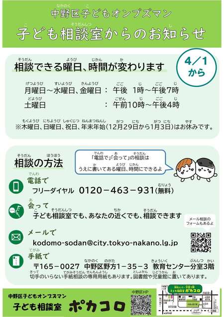 令和7年4月1日から、中野区子ども相談室「ポカコロ」の窓口開設時間が変わります。