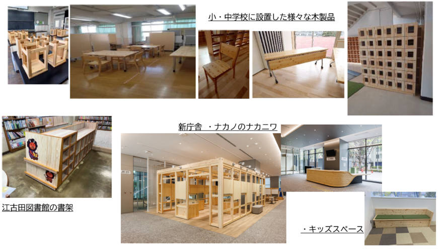 谷戸小学校、啓明小学校、南台小学校、南中野中学校、明和中学校の多摩産材を使用した木製什器類の購入 | 14,774,400 | 小・中学校校舎において、児童・生徒が使用するテーブル・椅子など、多摩産材を使用した製品を備品として購入した。 |