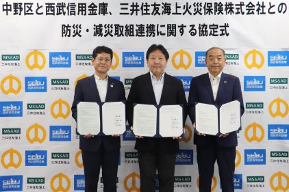 中野区は、大規模災害時に備える防災力の向上を図るとともに、減災の取り組みを推進し、安全と安心な地域社会とまちづくりの実現に資することを目的に、西武信用金庫及び三井住友海上火災保険株式会社と協定を締結しました。